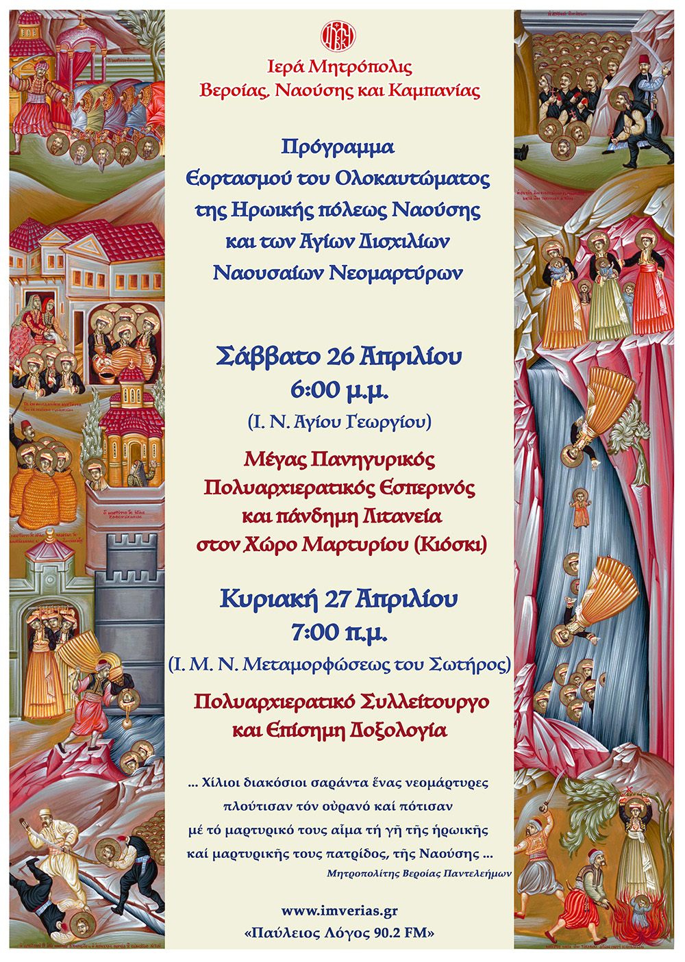 Το Σάββατο 26 Απριλίου, στις 6:00 μ.μ., στον Ιερό Ναό του Αγίου Γεωργίου Ναούσης θα τελεστεί Μέγας Πανηγυρικός Πολυαρχιερατικός Εσπερινός. Ακολούθως, θα πραγματοποιηθεί πάνδημη Λιτανεία προς τον Χώρο Μαρτυρίου (Κιόσκι), εκεί όπου οι πρόγονοί μας σφράγισαν με αίμα την πίστη και την ελευθερία.