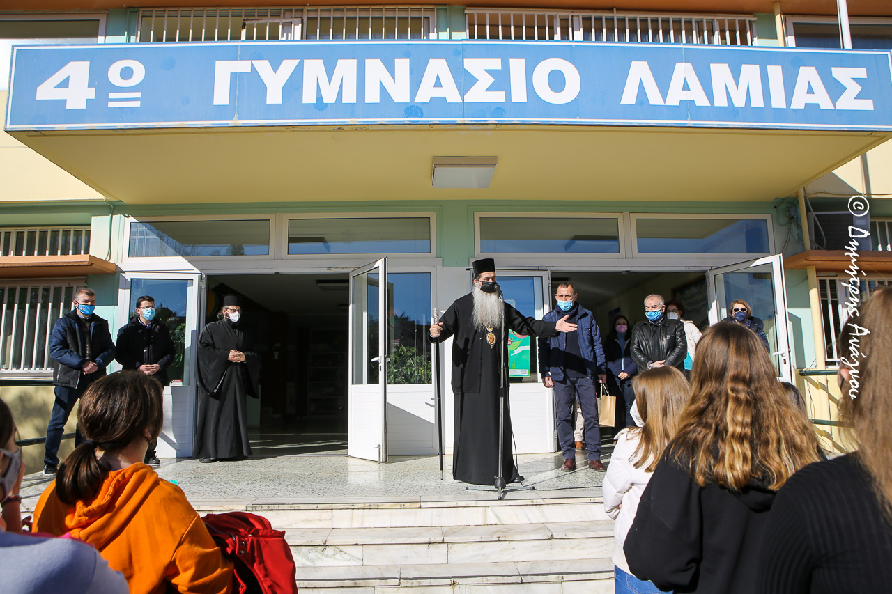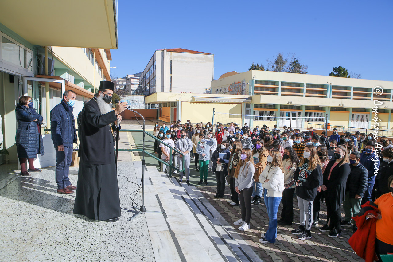 Αρχικά ο Σεβασμιώτατος κ. Συμεών στο προαύλιο του σχολείου ευχήθηκε πατρικά σε όλους τους μαθητές και τις μαθήτριες του σχολείου καλή πρόοδο και αναφέρθηκε στην αιτία της καλής προόδου του ανθρώπου , που είναι η αγάπη και ο αλληλοσεβασμός στον συνάνθρωπο και εν προκειμένω στον συμμαθητή μας, όπως τόνισε.