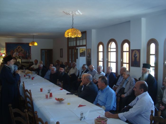 Μετά το πέρας της Αρχιερατικής Θ. Λειτουργίας οι προσκυνήτριες μετέβησαν στο Αρχονταρίκι του Ι. Ησυχαστηρίου για το παραδοσιακό κέρασμα. Εκεί ο Σεβ. Μητροπολίτης μας κ. Διονύσιος τις υποδέχτηκε με πολλή αγάπη και ομίλησε σ᾿ αυτές σχετικά με τον Ιδρυτή της Τοπικής μας Εκκλησίας Απ. Παύλο, κάνοντας αναφορά και στους σύγχρονους Χριστιανούς ως «αγίους», τονίζοντας ότι από την στιγμή της Βαπτίσεώς μας γινόμαστε δυνάμει «άγιοι» και οφείλουμε να συνεχίσουμε τον καλό πνευματικό αγώνα, ώστε να καταστούμε «τω όντι» άγιοι.