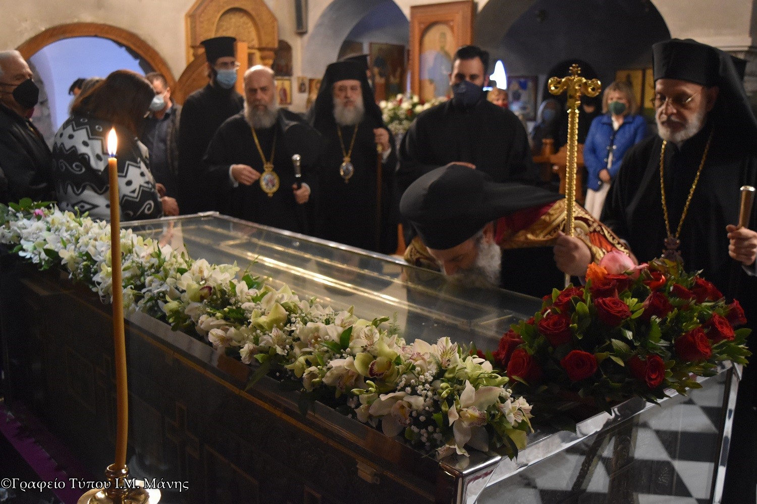 Στον Πανηγυρικό πολυαρχιερατικό Εσπερινό, χοροστάτησε ο Σεβασμιώτατος Μητροπολίτης Μάνης κ. Χρυσόστομος, και συγχοροστάτησαν ο Σεβασμιώτατος Μητροπολίτης Θεσσαλιώτιδος και Φαναριοφερσάλων κ. Τιμόθεος και ο Σεβασμιώτατος Μητροπολίτης Κηφισίας, Αμαρουσίου, Ωρωπού και Μαραθώνος κ. Κύριλλος, με την παρουσία ιερέων και διακόνων της Μητροπόλεως.