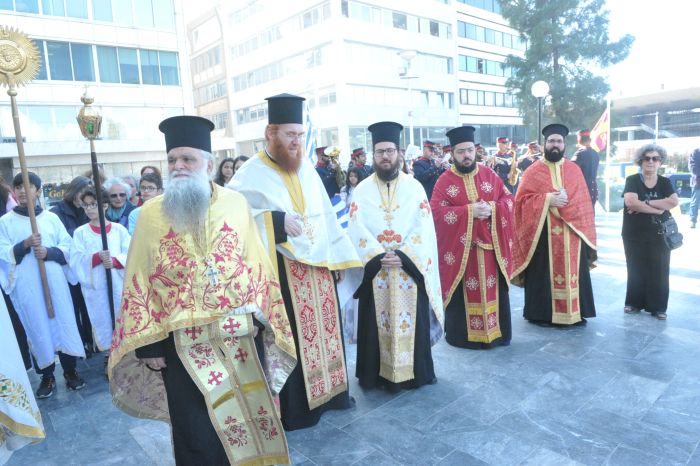 Στον προαύλιο χώρο του Ιερού Ναού ο Σεβασμιώτατος Μητροπολίτης Πειραιώς κ.κ. Σεραφείμ με την συνοδεία του Ιερού Κλήρου του αγήματος του Λιμενικού Σώματος, της φιλαρμονικής του Δήμου Πειραιά και Σχολείων της ενορίας και πλήθος κόσμου παρέλαβον το διακομισθέν Ιερό λείψανο.