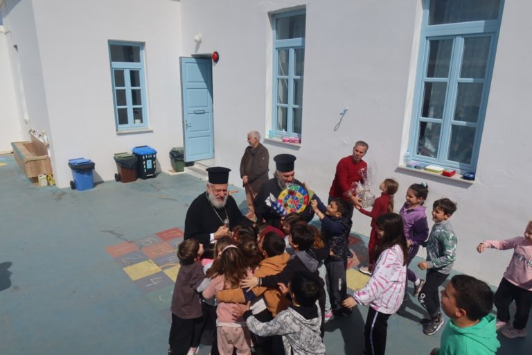 Ο Μητροπολίτης Σύρου ευχαρίστησε για την υποδοχή, συνεχάρη τους Εκπαιδευτικούς για το έργο τους, διηγήθηκε διδακτικές ιστορίες και απηύθυνε πατρικές νουθεσίες στα παιδιά, στα οποία προσέφερε εκπαιδευτικό υλικό, παιχνίδια και δώρα.