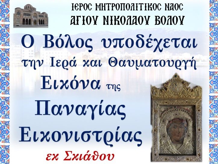 Βόλος: Σπουδαίο γεγονός και εξαιρετική ευλογία για την πόλη του Βόλου συνιστά η έλευση και ολιγοήμερη παραμονή στον Μητροπολιτικό Ιερό Ναό Αγίου Νικολάου της Ιεράς και Θαυματουργού Εικόνος της Παναγίας Εικονιστρίας, που φυλάσσεται στο νησί της Σκιάθου.