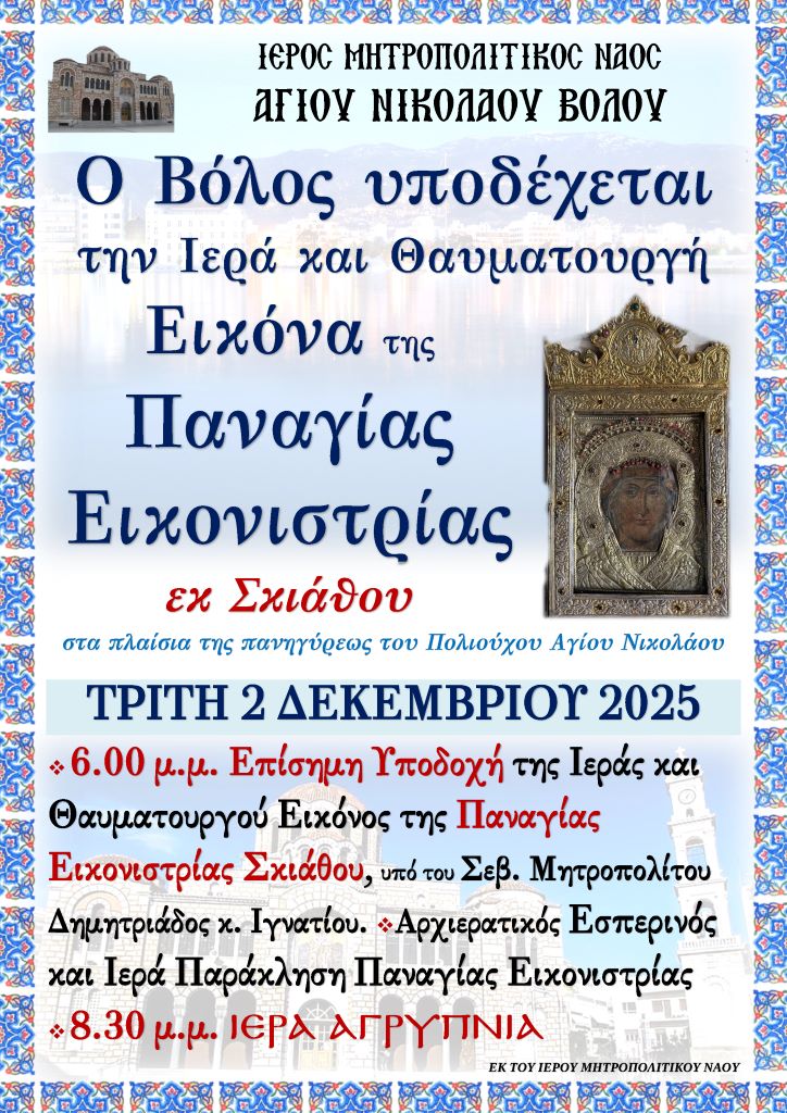 Η Ιερά Εικόνα θα αφιχθεί στον Μητροπολιτικό Ναό του Βόλου την Τρίτη 2 Δεκεμβρίου 2025, στις 6μ.μ., στο πλαίσιο της ιεράς πανηγύρεως του Πολιούχου του Βόλου Αγίου Νικολάου. Την Παναγία Εικονίστρια θα υποδεχθεί επισήμως ο Μητροπολίτης Δημητριάδος κ. Ιγνάτιος, επικεφαλής του ιερού Κλήρου και του ευσεβούς λαού.