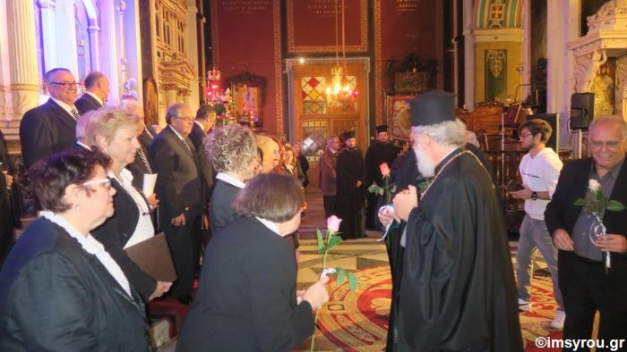 Στον μεγαλοπρεπή Ιερό Ναό του Αγίου Νικολάου, στην Ερμούπολη, πραγματοποιήθηκε και εφέτος η καθιερωμένη μεθέορτος Μουσική και Πνευματική Εκδήλωση, παρουσία των Σεβασμιωτάτων Μητροπολιτών Νέας Σμύρνης κ. Συμεών και Σύρου κ. Δωροθέου Β’, του Χωρικού Αντιπεριφερειάρχη Κυκλάδων κ. Γ. Λεονταρίτη, Αντιδημάρχων και Συμβούλων του Δήμου Σύρου Ερμούπολης, του Προϊστάμενου της Δευτεροβάθμιας Εκπαίδευσης, εκπαιδευτικών και πλήθους φιλόμουσων Συριανών.