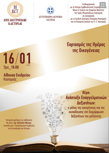 Ι.Μ. ΚΑΣΤΟΡΙΑΣ: Το Κέντρο Συμβουλευτικής Συμπαράστασης Νέων & Γονέων του Γραφείου Νεότητος της Ιεράς Μητροπόλεως Καστορίας απευθύνει πρόσκληση για την εσπερίδα που διοργανώνεται με αφορμή τον εορτασμό της Ημέρας της Οικογένειας, υπό την αιγίδα της Ιεράς Μητροπόλεως Καστοριάς και της Διεύθυνσης Δευτεροβάθμιας Εκπαίδευσης Καστοριάς.
