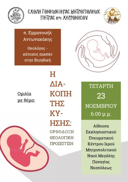 Η Διακοπή της Κύησης θα είναι το θέμα της τρίτης συναντήσεως της Σχολής Γονέων της Ιεράς Μητρόπολης Πέτρας και Χερρονήσου.