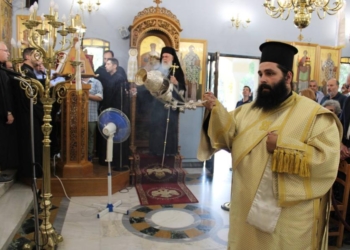 συμπαραστατούμενος από τον Ιεροκήρυκα της Μητροπόλεως Πανοσ. Αρχιμ. π. Νικάνωρα Καραγιάννη, τον Γενικό Αρχιερατικό Επίτροπο Αιδεσ. Πρωτ. π. Χρίστο Κυριακόπουλο και Ιερείς της Μητροπόλεως και ετέρων Μητροπόλεων.