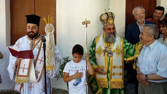 Στο τέλος της Θείας Λειτουργίας πραγματοποιήθηκε η λιτάνευση της Ιεράς Εικόνος του Αγίου πέριξ του Καθολικού της Μονής και η ευλόγηση των άρτων”.
