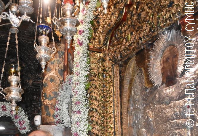 Το πρωί του Σαββάτου, κυριώνυμη ημέρα της Πανηγύρεως, τελέστηκε Αρχιερατική Θεία Λειτουργία, με τη συμμετοχή δεκάδων κληρικών, μοναχών και πλήθους προσκυνητών. Μετά την Απόλυση, ακολούθησε η μεγαλειώδης Λιτανεία της Ιεράς Εικόνας, που διέσχισε το συγκρότημα της Μονής και το παραλιακό μέτωπο. Προπορεύονταν ο Τίμιος Σταυρός, τα Λάβαρα, η Φιλαρμονική του Δήμου Ροδίων και στρατιωτικό άγημα της Φρουράς Σύμης.