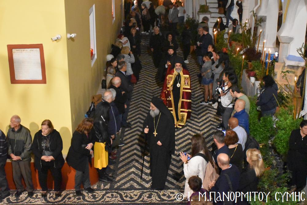Το απόγευμα της παραμονής, ο Σεβασμιώτατος Μητροπολίτης Σύμης κ. Χρυσόστομος χοροστάτησε στον Μέγα Πανηγυρικό Εσπερινό, πλαισιωμένος από τον Καθηγούμενο της Μονής Ιβήρων του Αγίου Όρους, αρχιμανδρίτη π. Ναθαναήλ, και πλήθος ιερέων από όλη την Ελλάδα. Ιδιαίτερη συγκίνηση προκάλεσε η παρουσία του Εψηφισμένου Επισκόπου Ροδοστόλου κ. Αντωνίου, ο οποίος συμπροσευχήθηκε εντός του ιερού Βήματος.