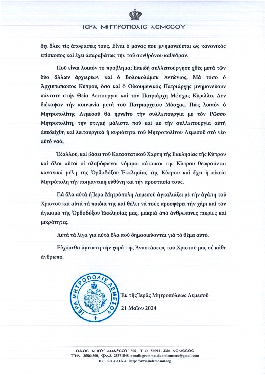 Ι.Μ. ΛΕΜΕΣΟΥ – Την δική της απάντηση στους επικριτές για το συλλείτουργο του Πανιερωτάτου Μητροπολίτη Λεμεσού κ. Αθανασίου με τον Μητροπολίτη Βολοκολάμσκ κ. Αντώνιο την Κυριακή των Μυροφόρων, 19 Μαϊου, κατά τα εγκαίνια του Ιερού Ναού Αγίου Νικολάου Λεμεσού έδωσε η Ιερά Μητρόπολη Λεμεσού και αναρωτείται «που ακριβώς εντοπίζεται το πρόβλημα»;