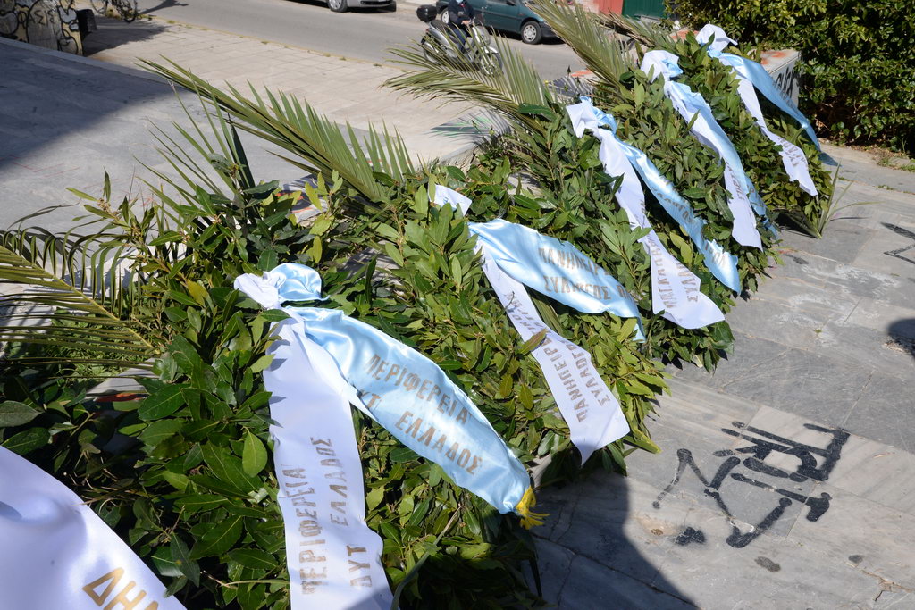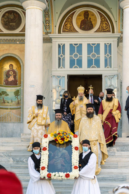 Μετά τό πέρας τής Θείας Λειτουργίας καί τήν ομιλία τού Σεβασμιωτάτου, λιτανεύτηκε, από τόν Ναό έως τήν προτομή τού Εθνάρχου Ιερομάρτυρος Πατριάρχου, η ιερά Εικόνα του, ανεπέμφθη δέησις καί κατετέθησαν στέφανοι από τούς Εκπροσώπους τής Περιφέρειας, τού Δήμου, τού Επιμελητηρίου Αχαΐας, τούς Προέδρους τών Συλλόγων τών εν Πάτραις Γορτυνίων καί Αρκάδων καί άλλους Εκπροσώπους τοπικών Αρχών καί Φορέων.