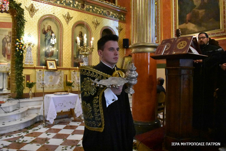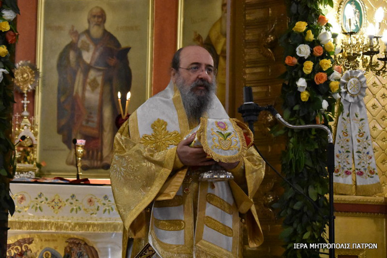 Ανήμερα εχοροστάτησε στόν Όρθρο καί ετέλεσε τήν Θεία Λειτουργία ο Σεβασμιώτατος Μητροπολίτης Πατρών κ.κ. Χρυσόστομος, ο οποίος εκήρυξε τόν θείο λόγο μέ θέμα: «Η μεγάλη ευλογία από τόν Θεό νά έχωμε τά Λείψανα τών Αγίων».
