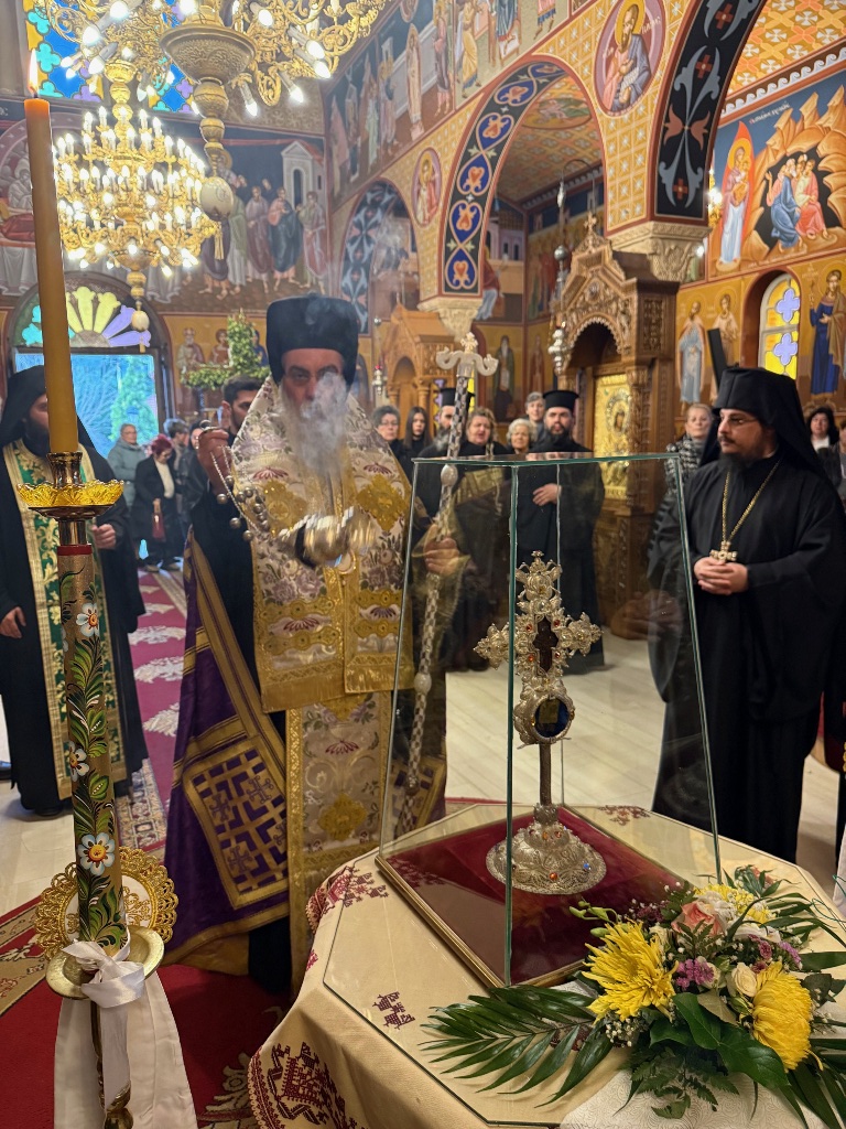 Του Εσπερινού προηγήθηκε η υποδοχή του Τιμίου Σταυρού του Αγίου Παρθενίου, κτίτορος της Ιεράς Μονής Κουδουμά, (Ιερά Μητρόπολης Γορτύνης και Αρκαδίας). Πρόκειται περί Σταυρού τον οποίο ο Άγιος Παρθένιος φορούσε, ως φυλακτό, και ο οποίος, πολύτιμη παρακαταθήκη, φυλάσσεται στην Ιερά Μονή Κουδουμά, με πλήθος θαυμαστών να μαρτυρούνται από τις πολλές ευεργεσίες Του. Τον Τίμιο Σταυρό κόμισε, εκ προσώπου του Καθηγουμένου, Παν. Αρχιμανδρίτου π. Μακαρίου (Σπυριδάκη), ο αδελφός της Μονής, π. Αιμιλιανός , λόγω εκτάκτου κωλύματος του Καθηγουμένου π. Μακαρίου, ο οποίος είχε κληθεί και ως ομιλητής, την ομιλία του οποίου μετέφερε ο αδελφός της Μονής, με θέμα: «Η αντιμετώπιση της άρσης του Σταυρού στην καθημερινή ζωή του Χριστιανού».