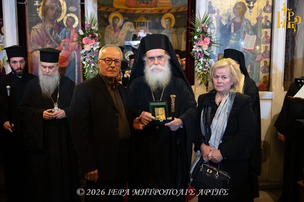 Κατά τον Εσπερινό, η Ιερά Μητρόπολις Άρτης τίμησε την οικογένεια του αειμνήστου Σμηναγού Αναστασίου Μπαλατσούκα, με την επίδοση πλακέτας με την εικόνα της Αγίας Θεοδώρας, Βασίλισσας και Πολιούχου Άρτης, ως σύμβολο μνήμης και ευλαβείας.
