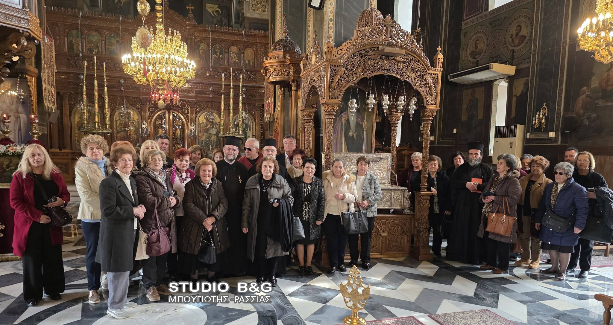Η εκδρομή τελείωσε με την επίσκεψη στην ενορία της Ευαγγελίστριας Ναυπλίου όπου υπάρχει το ομοίωμα του Αγίου Παϊσίου του Αγιορείτη . Εκεί τους περίμενε ο δραστήριος ιερέας του ναού π. Ελευθέριος Μίχος , όπου τους ξενάγησε στο εκκλησιαστικό μουσείο και στους άλλους χώρους του συγκροτήματος . Τέλος οι εκδρομείς συναντήθηκαν και παρακολούθησαν την ομιλία από τον Μητροπολίτη Αργολίδας Νεκτάριο με θέμα «Η γυναίκα στην Χριστιανική Ορθόδοξη Εκκλησία».