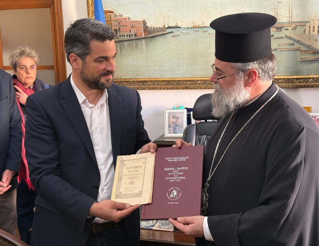 Η συνάντηση ολοκληρώθηκε με την ανταλλαγή αναμνηστικών δώρων. Ο Δήμαρχος Χανίων προσέφερε στον κ. Τίτο ανατύπωση σπάνιου βιβλίου της Δημοτικής Βιβλιοθήκης Χανίων, με τίτλο: «ΠΙΣΤΙΣ – ΠΑΤΡΙΣ ΗΤΟΙ ΛΟΓΟΙ ΤΙΝΕΣ ΚΑΙ ΠΡΟΣΦΩΝΗΣΕΙΣ – 1897 – 1901», Τίτου Ζωγραφίδου, Επισκόπου Πέτρας. Από την πλευρά του ο Μητροπολίτης προσέφερε στον Δήμαρχο Χανίων αναμνηστική πλακέτα της ενθρονίσεως.