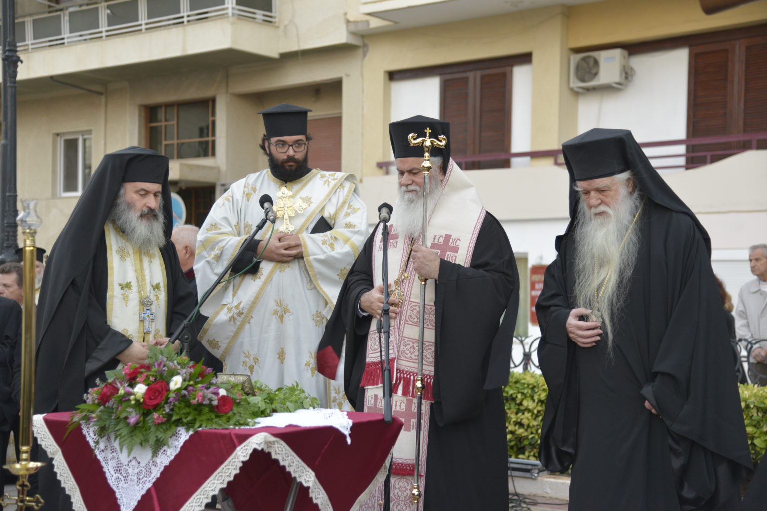 Η λιτανεία, η οποία ξεκίνησε από την πλατεία, κατευθύνθηκε προς τον Μητροπολιτικό Ιερό Ναό της Παναγίας Φανερωμένης, όπου ο λαός συγκεντρώθηκε για να προσκυνήσει τα Άχραντα Πάθη του Κυρίου. Στην αυλή του Ναού, ο Σεβασμιώτατος κ. Ιερώνυμος, γονυκλινής, ανέπεμψε δέηση για την κατάπαυση της ανομβρίας που πλήττει την περιοχή και ολόκληρη τη χώρα.
