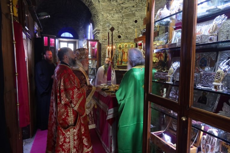 ιερούργησε στο Καθολικό της ομώνυμης Ιεράς Μονής, με τη συμμετοχή του Ηγουμένου Αρχιμ. Δωροθέου και των Αδελφών της Μονής, τη συνευχητική παρουσία της Ηγουμενευούσης της Ιεράς Μονής Ζωοδόχου Πηγής, Μοναχής Παρθενίας και Μοναζουσών από τη Μονή και Χριστιανών, οι οποίοι προσήλθαν με ταξη, τηρούντες τα ισχύοντα μέτρα.