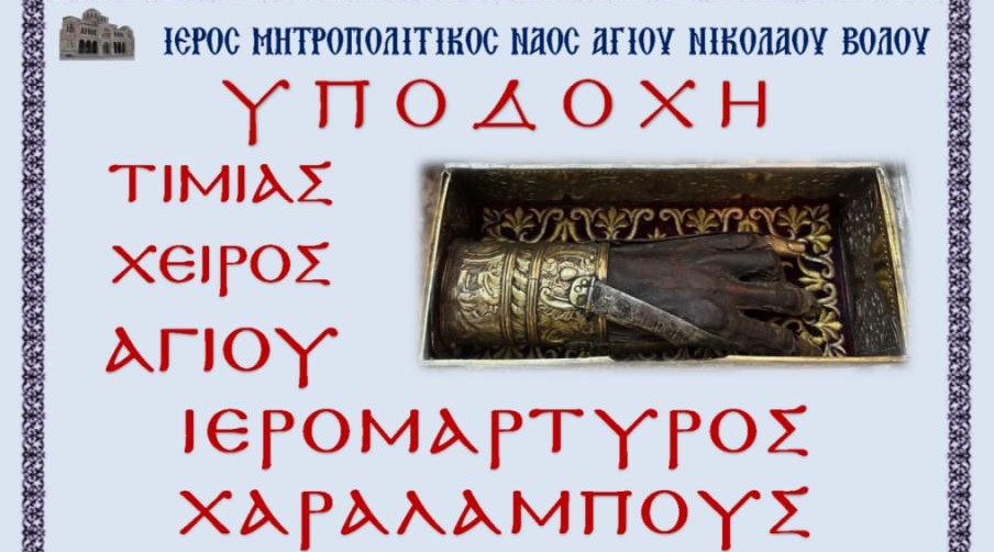 Βόλος: Εξαιρετική ευλογία για την πόλη του Βόλου και την Τοπική Εκκλησία συνιστά η έλευση και ολιγοήμερη παραμονή στον Μητροπολιτικό Ιερό Ναό Αγίου Νικολάου Βόλου, της αφθάρτου δεξιάς χειρός του Αγίου Ιερομάρτυρος Χαραλάμπους, που φυλάσσεται στην Μονή Παναγίας Μεγάλου Σπηλαίου Καλαβρύτων.