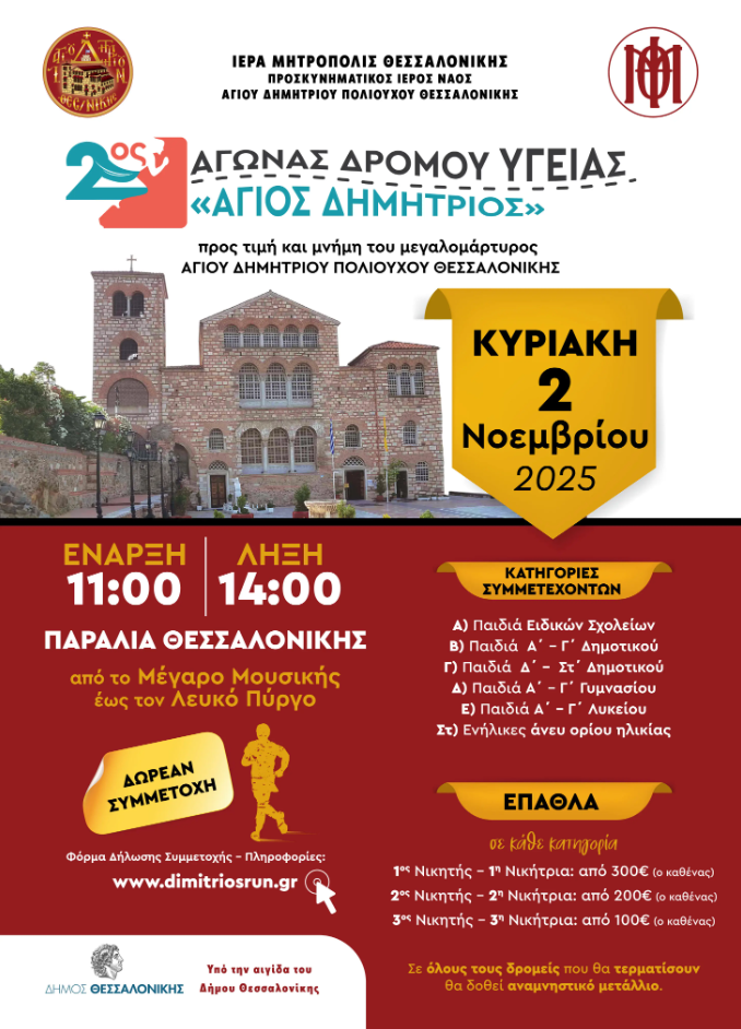 Θεσσαλονίκη: Με στόχο την ευαισθητοποίηση του κοινού σε θέματα σωματικής και ψυχικής υγείας και ευγενούς άμιλλας και την απόδοση τιμής στο πρόσωπο του Αγίου Δημητρίου πραγματοποιείται σήμερα ο «2ος αγώνας δρόμου υγείας ‘Άγιος Δημήτριος’ που διοργανώθηκε από την Ιερά Μητρόπολη Θεσσαλονίκης και τελεί υπό την αιγίδα του Δήμου Θεσσαλονίκης.