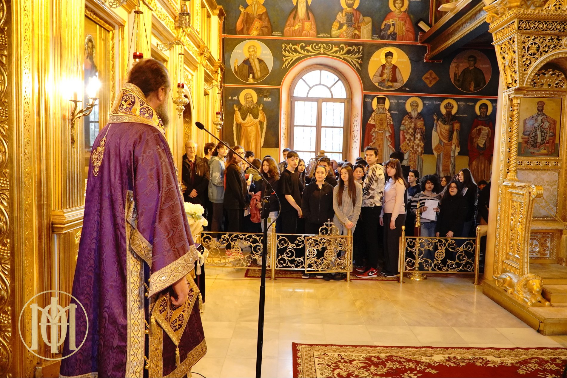 Η Προηγιασμένη Θεία Λειτουργία τελέσθηκε με τη συμμετοχή 170 μαθητών του Μουσικού Σχολείου Πυλαίας οι οποίοι με την καθοδήγηση και προετοιμασία από τον Καθηγητή Βυζαντινής Μουσικής Άρχοντα Δομέστικο της Μ.τ.Χ.Ε. κ. Μιλτιάδη Παππά, έψαλλαν και απέδωσαν τα μουσικά κείμενα άριστα. Ο Ποιμενάρχης μας, εξηγούσε ανά διαστήματα τα τελούμενα της Προηγιασμένης Θείας Λειτουργίας στους μαθητές του Σχολείου. Ο Μητροπολίτης προ της απολύσεως ευχαρίστησε και ευλόγησε τους μαθητές για την συμμετοχή τους, συνεχάρη και τους εκπαιδευτικούς του Σχολείου για την παιδεία που προσφέρουν στους νέους μαθητές. Ως ανάμνηση της σημερινής Θείας Λειτουργίας, οι Ιερείς του Ναού, προσέφεραν με αγάπη κέρασμα και αναμνηστικά στους συμμετέχοντες μαθητές και καθηγητές.