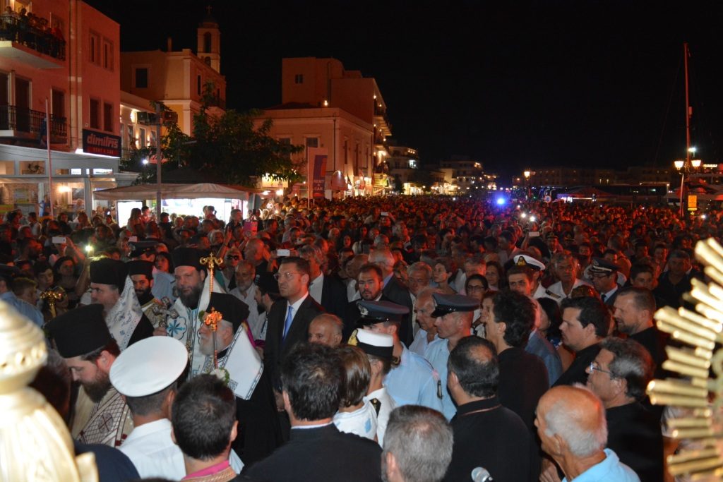 Στον Ναό της Αγίας Παρασκευής την ανέμεναν οι Αρχιερείς, οι Ιερείς, οι τα πρώτα φέροντες και ευσεβείς Χριστιανοί, όπου και ξεκίνησε η εκκλησιαστική πομπή δια μέσου της παραλιακής οδού υπο τους συριγμούς των πλοίων και των λεωφορείων του ΚΤΕΛ και με τη ρίψη πυροτεχνημάτων και φωτοβολίδων τα οποία έδωσαν μια ατμόσφαιρα πανηγυρική.