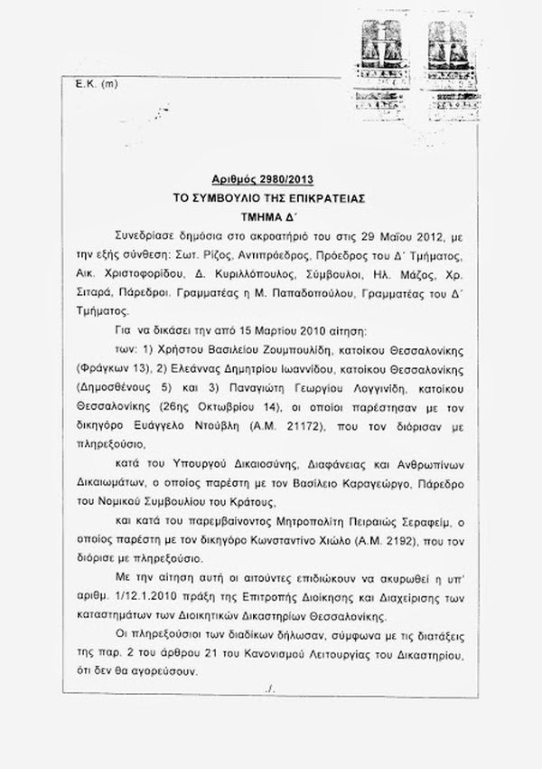 Δημοσιοποιούμε την υπ’ αριθμ. 2980/2013 Απόφασι του Δ΄ Τμήματος του Συμβουλίου της Επικρατείας με την οποίαν απέρριψε την αίτηση των Δικηγόρων Χρήστου Ζουμπουλίδη, Ελεάνας Ιωαννίδου και Παναγιώτου Λογγινίδη κατοίκων Θεσσαλονίκης κατά της υπ’ αριθμ. 1/12.1.2010 Πράξεως της Επιτροπής Διοίκησης και Διαχείρισης των Καταστημάτων των Διοικητικών Δικαστηρίων Θεσσαλονίκης διά της οποίας απερρίφθη η αίτησις των ανωτέρω για να αφαιρεθούν όλες οι θρησκευτικές εικόνες και τα σύμβολα από τους τοίχους των Δικαστικών Αιθουσών της αρμοδιότητός της. Όταν η Δικαιοσύνη είναι αδέσμευτη και ακηδεμόνευτη και γίνεται σεβαστή η διάκρισις των εξουσιών εκφράζει το περί δικαίου αίσθημα του λαού αλλά και διακονεί την αλήθεια.