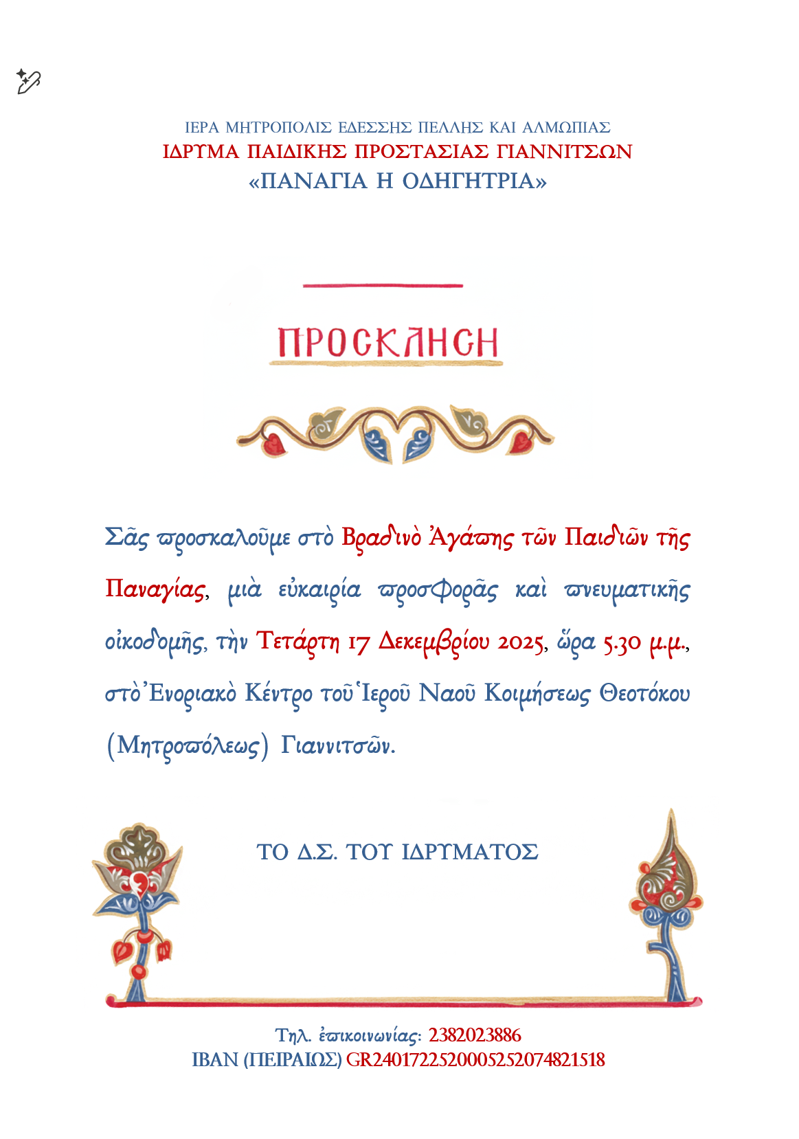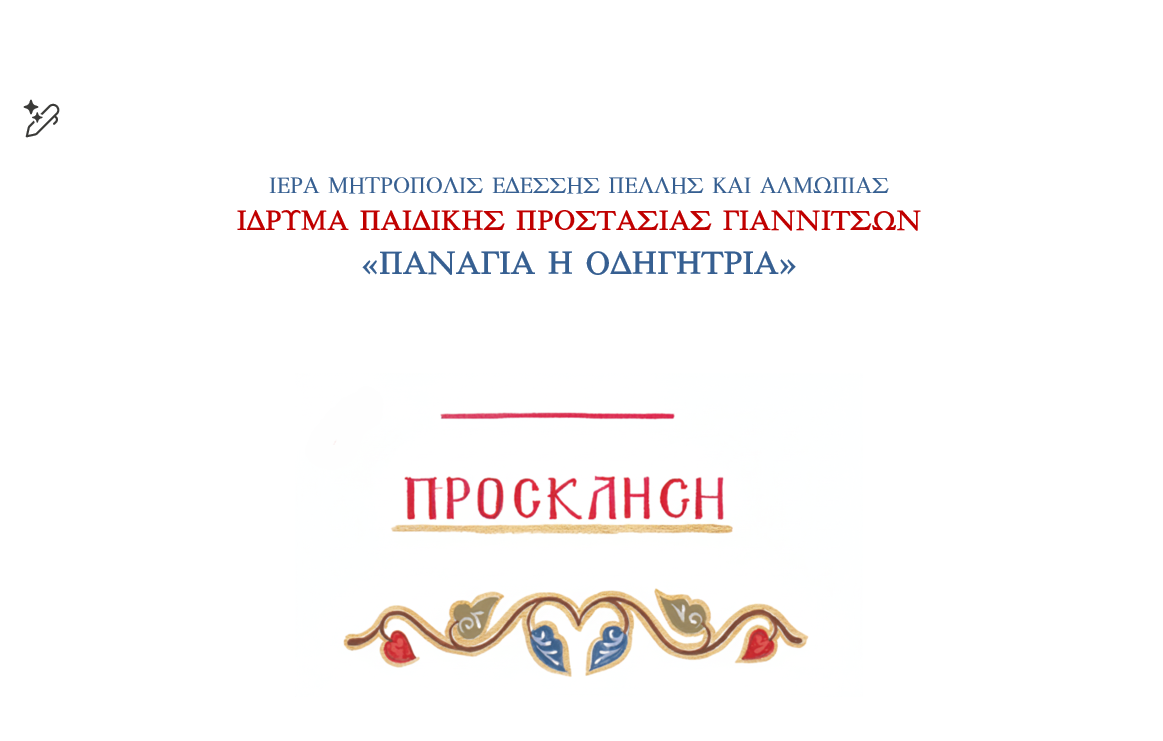 ΓΙΑΝΝΙΤΣΑ: Την Τετάρτη 17 Δεκεμβρίου 2025 το Ίδρυμα Παιδικής Προστασίας «Παναγία η Οδηγήτρια» της ενορίας Κοιμήσεως της Θεοτόκου (Μητροπόλεως) Γιαννιτσών διοργανώνει Βραδινό Αγάπης, το οποίο θα πραγματοποιηθεί στις 5.30 μ.μ. στην Αίθουσα Εκδηλώσεων της ενορίας.