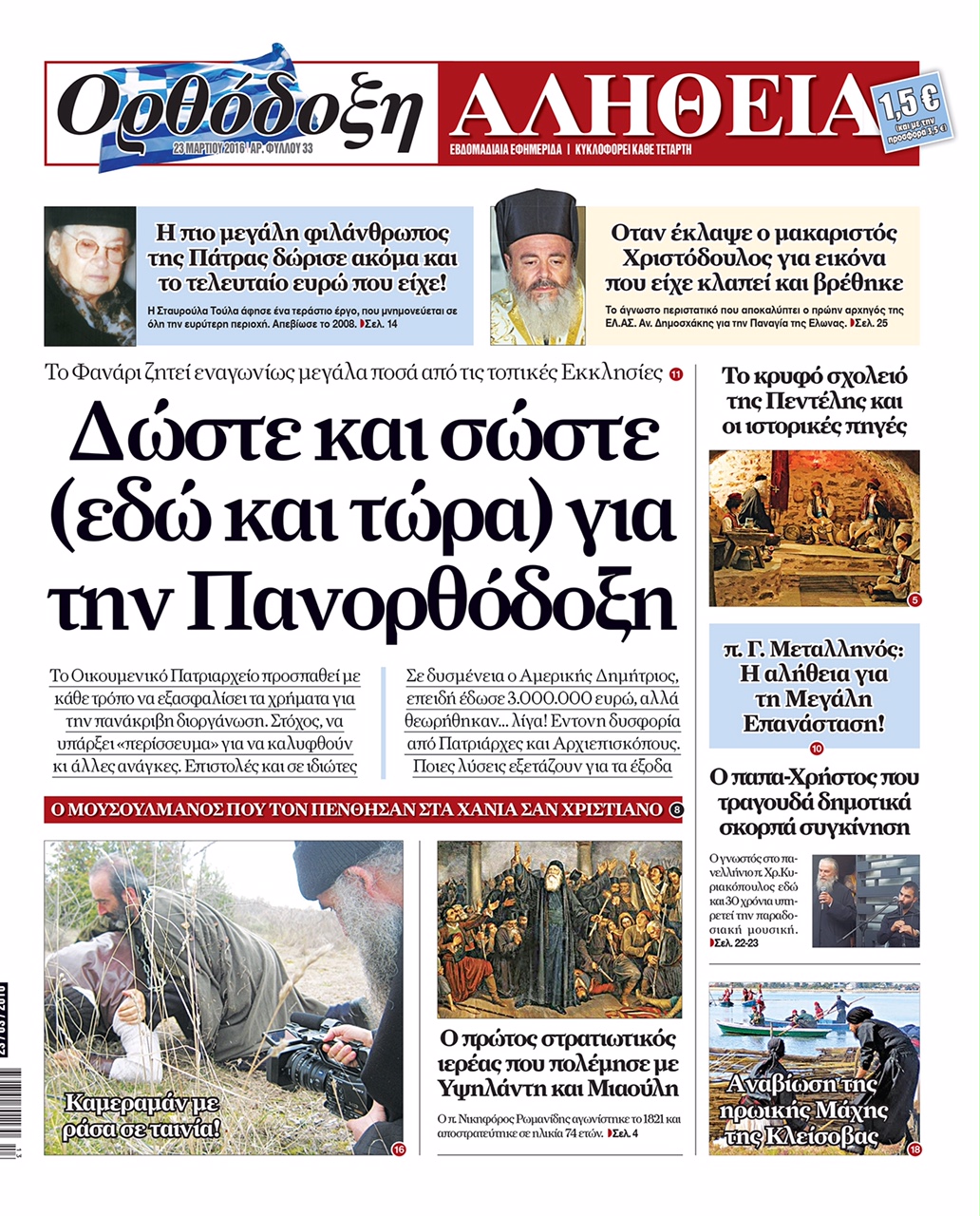 Η εφημερίδα στο βασικό της θέμα αποκαλύπτει την αλήθεια για τα οικονομικά δεδομένα της Πανορθόδοξης και τις προσπάθειες του Οικουμενικού Πατριαρχείου να εξασφαλίσει τα απαραίτητα χρήματα. Πρόκειται για ένα αναλυτικό και εξόχως διαφωτιστικό ρεπορτάζ.