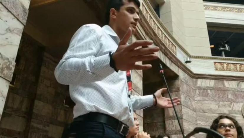 Η Μακεδονία ήταν, είναι και θα είναι ελληνική», είπε με σθένος και έμφαση ο μαθητής με τους υπόλοιπους έφηβους βουλευτές να τον χειροκροτούν και να τον επευφημούν.