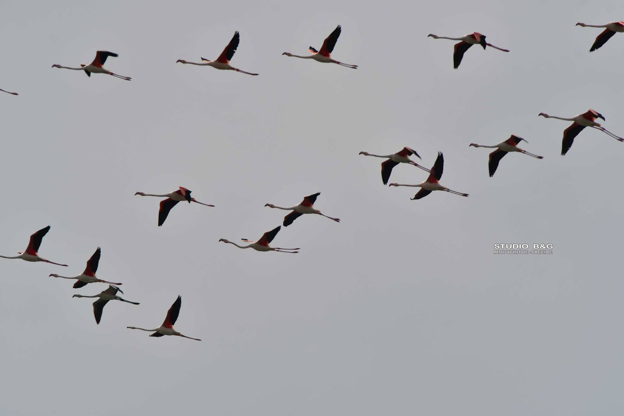 ΑΡΓΟΛΙΔΑ: Σμήνος φλαμίνγκο πετούσε πάνω από τον υδροβιότοπο Ναυπλίου Νέας Κίου στην Αργολίδα, Τρίτη 6 Οκτωβρίου 2020.