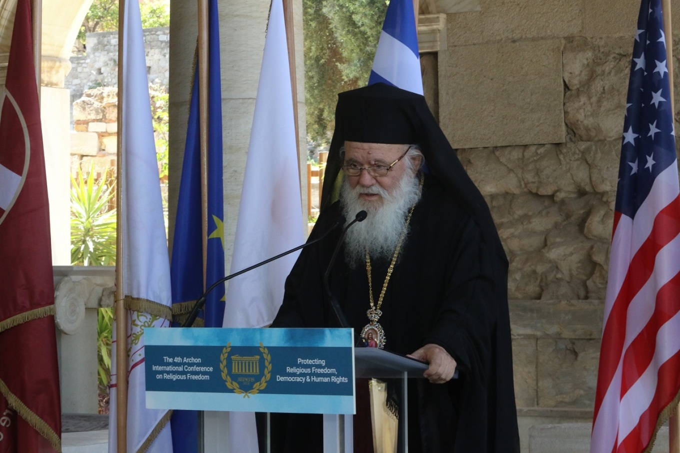 Στον δικό του, χαιρετισμό, ο Αρχιεπίσκοπος Αθηνών και Πάσης Ελλάδος κ. Ιερώνυμος, ανέφερε μεταξύ άλλων πως «σε αυτή την εποχή όπου πολλοί σφετερίζονται κοινές αξίες της ανθρωπότητας και απαξιώνουν άλλες με τρόπο αυθαίρετο, η προβολή από το Συνεδριό σας του τρίπτυχου της θρησκευτικής ελευθερίας, της δημοκρατίας και των ανθρωπίνων δικαιωμάτων στην προοπτική της πνευματικής μας Παράδοσης αποκτά ιδιαίτερη σημασία».
