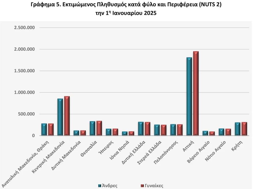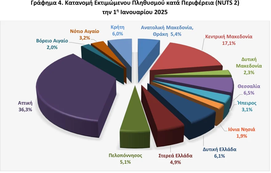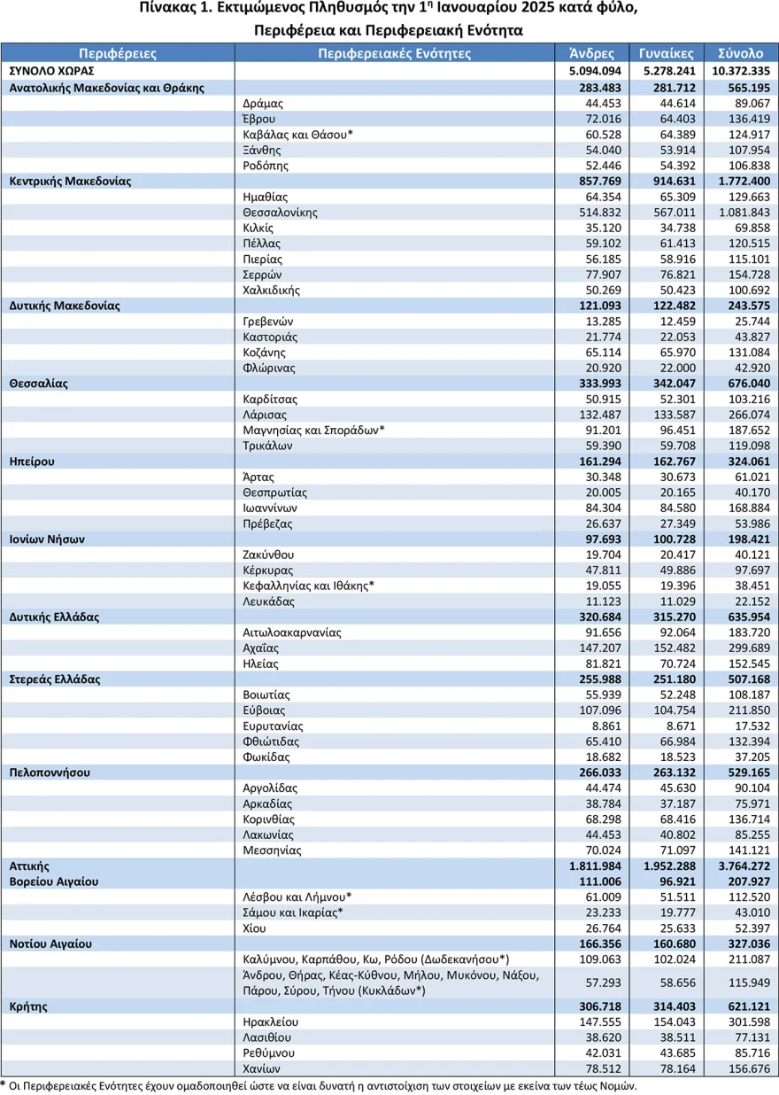 Σύμφωνα με τα πρόσφατα στοιχεία της Ελληνική Στατιστική Αρχή, ο μόνιμος πληθυσμός την 1η Ιανουαρίου 2025 ανήλθε σε 10.372.335 άτομα, με φυσική μείωση 57.564 το 2024. Οι άνω των 65 ετών αντιστοιχούν στο 23,7%, ενώ τα παιδιά 0–14 μόλις στο 12,8%. Ο δείκτης γονιμότητας κινείται γύρω στο 1,24 παιδιά ανά γυναίκα – από τους χαμηλότερους στην Ευρώπη. Το «κοκτέιλ» χαμηλής γονιμότητας, λιγότερων γυναικών αναπαραγωγικής ηλικίας και ταχείας γήρανσης, προδιαγράφει συνέχιση της συρρίκνωσης.