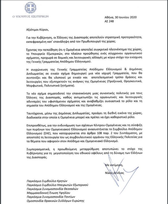 Τη θέση της ελληνικής Κυβέρνησης και του Υπουργείου Εξωτερικών, αναφορικά με το θέμα της προωθούμενης συγχώνευσης της Γενικής Γραμματείας Απόδημου Ελληνισμού(ΓΓΑΕ) αλλά και της ανασύστασης του Συμβουλίου Απόδημου Ελληνισμού(ΣΑΕ), εξηγεί ο Υπουργός Εξωτερικών, Νίκος Δένδιας, σε επιστολή που απέστειλε σε μια σειρά από μεγάλες οργανώσεις της Ομογένειας.