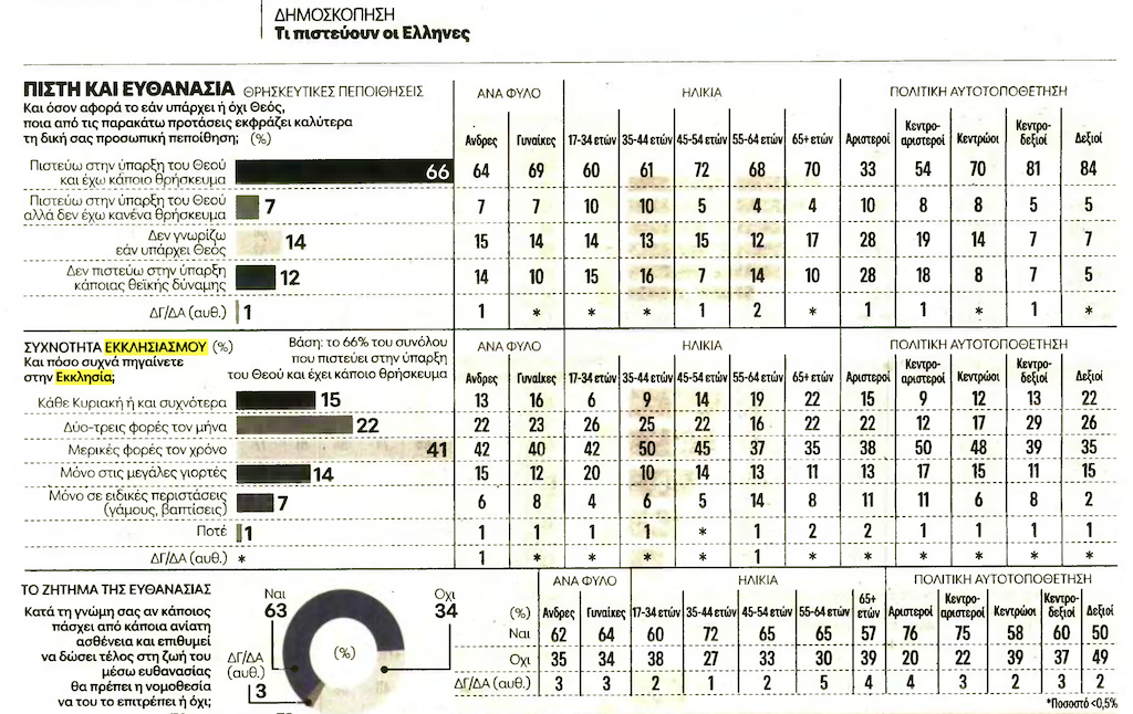 Το «μόνο» είναι σε εισαγωγικά διότι αποτελεί θετική έκπληξη ότι ακόμα και μεταξύ των κατεξοχήν πιστών η πλειοψηφία τάσσεται υπέρ της ευθανασίας– αυτό το στοιχείο πρέπει να το λάβουν πολύ σοβαρά υπόψη τους τόσο η Εκκλησία όσο και η Πολιτεία.