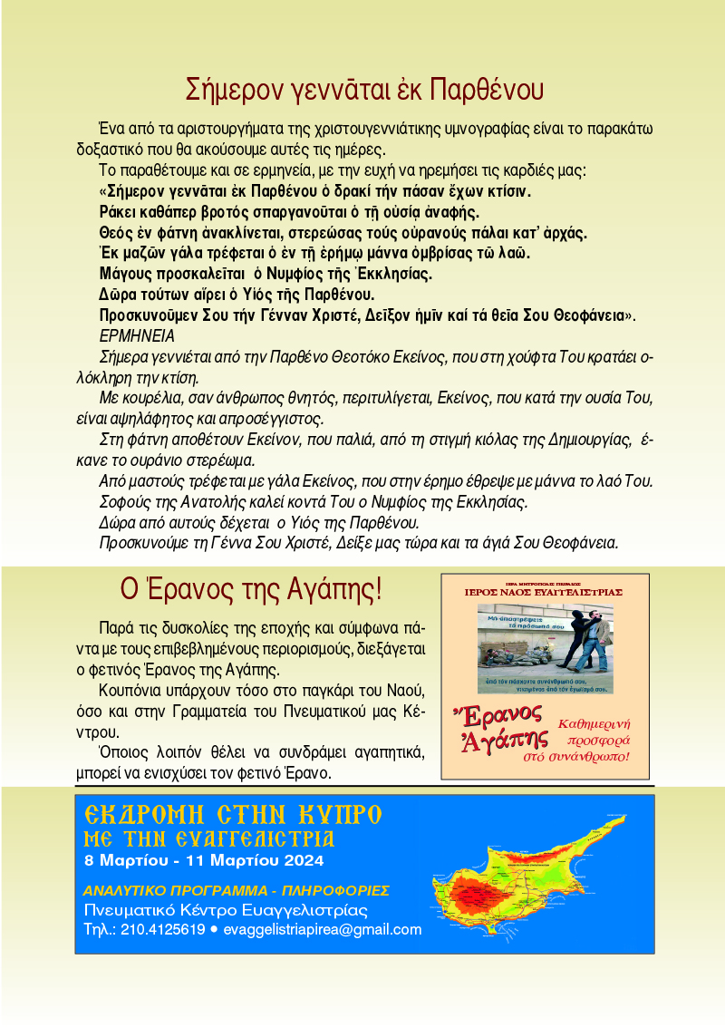Ευαγγελίστρια Πειραιώς: «Νέα Ενοριακή» 24 – 31 Δεκεμβρίου 2023
