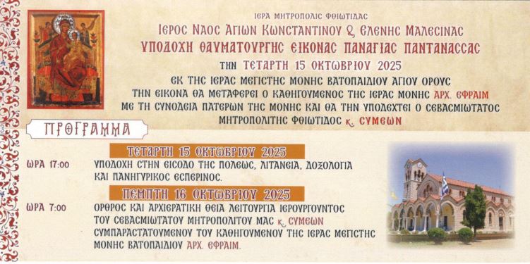 Μαλεσίνα: Θαυμαστό αντίγραφο της Θαυματουργού εικόνος της Παναγίας Παντανάσσης εκ της Ιεράς Μονής Βατοπαιδίου θα υποδεχθεί η κωμόπολις της Μαλεσίνας στη Λοκρίδα Φθιώτιδας.