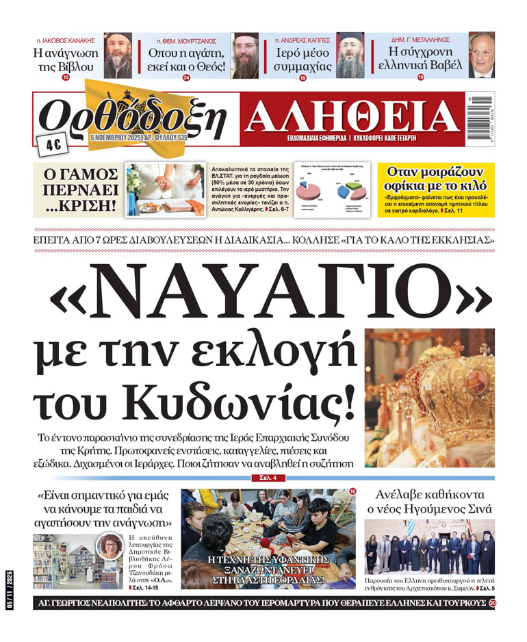 Στο βασικό της θέμα, η “Ο.Α.” προβάλλει το «ναυάγιο» στην εκλογή του νέου Κυδωνίας και Αποκορώνου, καθώς η διαδικασία «κόλλησε» αιφνιδίως, παρά τις επτά ώρες διαβουλεύσεων «για το καλό της Εκκλησίας».