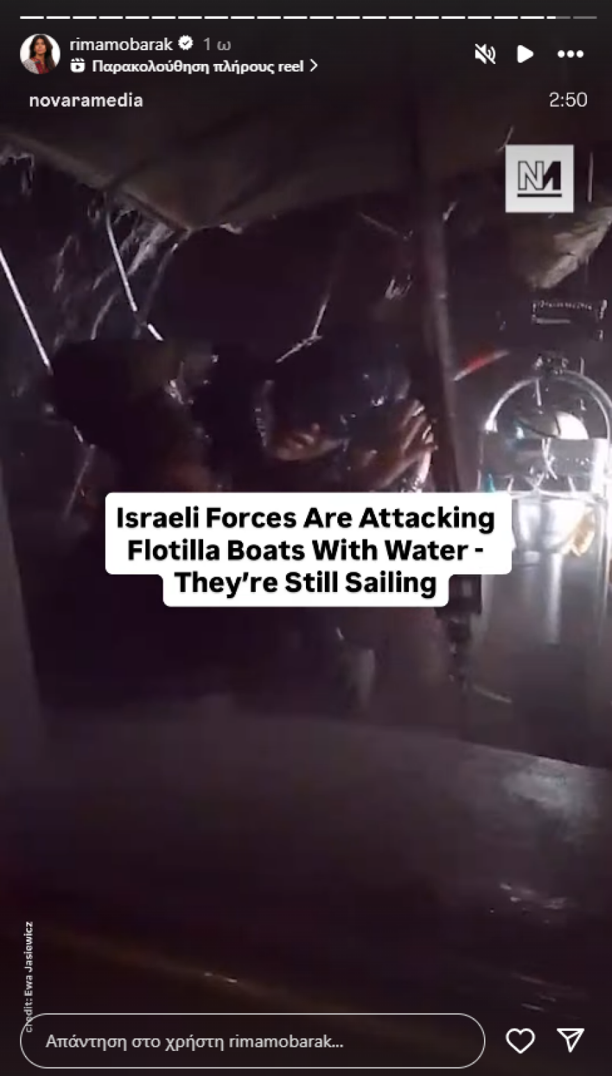 Νώριτερα, η Πέτη Πέρκα, βουλευτής της Νέας Αριστεράς που βρισκόταν στο πλοίο «Οξυγόνο», δημοσίευσε βίντεο στο Instagram στο οποίο αναφέρει πως εμφανίστηκαν πολεμικά πλοία του Ισραήλ: «Για κάποια στιγμή, πιστέψαμε, θέλαμε να πιστέψουμε ότι θα μπορέσουμε αύριο το μεσημέρι να είμαστε στη Γάζα και να αγκαλιάσουμε αυτά τα παιδιά που μας περιμένουν. Δυστυχώς όπως περιμέναμε σε 4 μίλια μπροστά από τα πρώτα πλοία έχουν εμφανιστεί πολεμικά πλοία του Ισραήλ. Άρα περιμένουμε να έρθουν και σε εμάς».