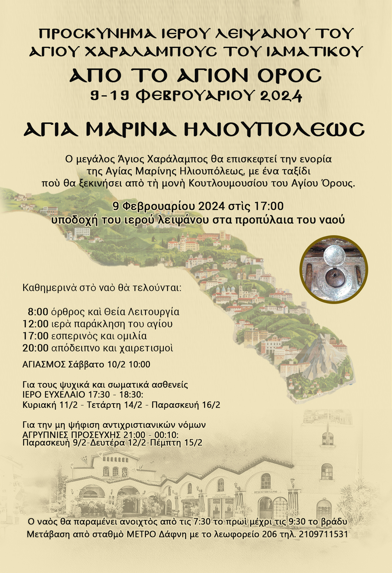 ΑΓΙΑ ΜΑΡΙΝΑ ΗΛΙΟΥΠΟΛΕΩΣ – Ο μεγάλος άγιος ιερομάρτυς Χαραλάμπης θα επισκεφτεί την ενορία της αγίας Μαρίνης, με ένα ταξίδι που θα ξεκινήσει εκ του παρά τας Καρυάς ιερού κελλίου των Αρχαγγέλων, εξαρτήματος της ιεράς μονής Κουτλουμουσίου του Αγίου Όρους.