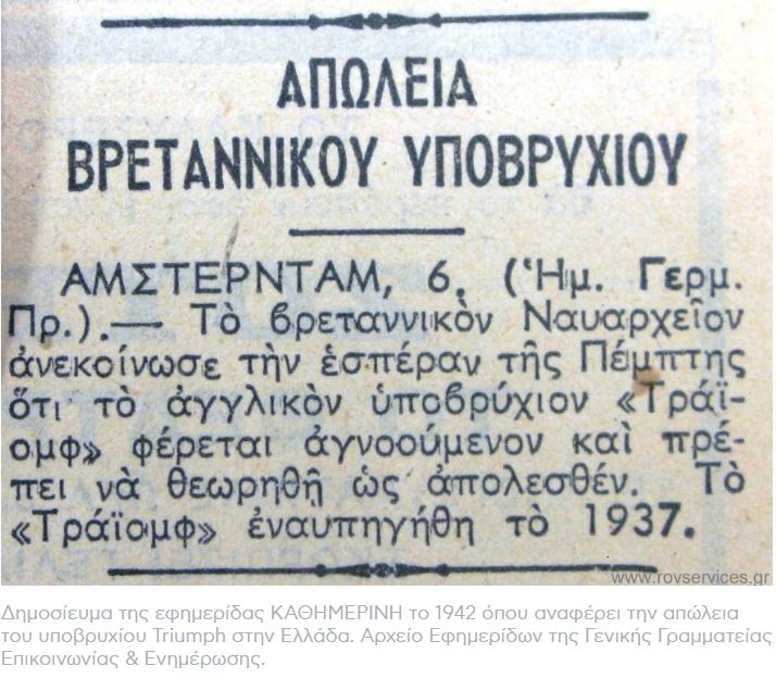 Από εκεί και μετά τα ίχνη του Τriumph εξαφανίζονται και στις 23 Γενάρη 1942 το Βρετανικό Ναυαρχείο αναφέρει σε ναυτικό σήμα ότι το υποβρύχιο Triumph πρέπει να θεωρείται απολεσθέν μετά από περιπολία στο Αιγαίο.