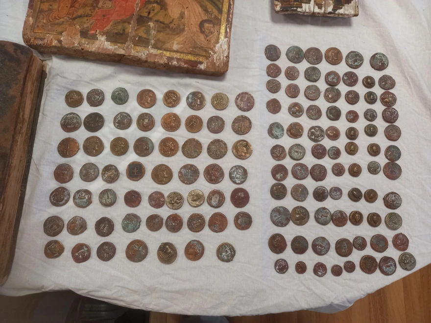 Συγκεκριμένα, οι αστυνομικοί κατέσχεσαν 264 αρχαία νομίσματα, 14 βυζαντινές εικόνες, δύο Ιερά Ευαγγέλια και ένα εκκλησιαστικό βιβλίο του 18ου αιώνα, καθώς και τρία αρχιερατικά εγκόλπια. Μαζί με αυτά βρέθηκε επαγγελματικό μηχάνημα ανίχνευσης μετάλλων, που δείχνει ότι η οργάνωση δεν περιοριζόταν μόνο στην κατοχή, αλλά και στην αναζήτηση νέων αρχαιοτήτων.