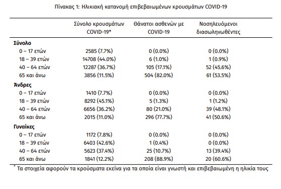 Η μέση ηλικία των κρουσμάτων είναι 38 έτη (εύρος 0 έως 103 ετών), ενώ η μέση ηλικία των θανάτων είναι 79 έτη (εύρος 25 έως 102 ετών). Η ηλικιακή κατανομή των (α) συνολικών κρουσμάτων, (β) των περιστατικών που κατέληξαν σε θάνατο και (γ) των ασθενών που νοσηλεύονται διασωληνωμένοι, είναι η ακόλουθη: