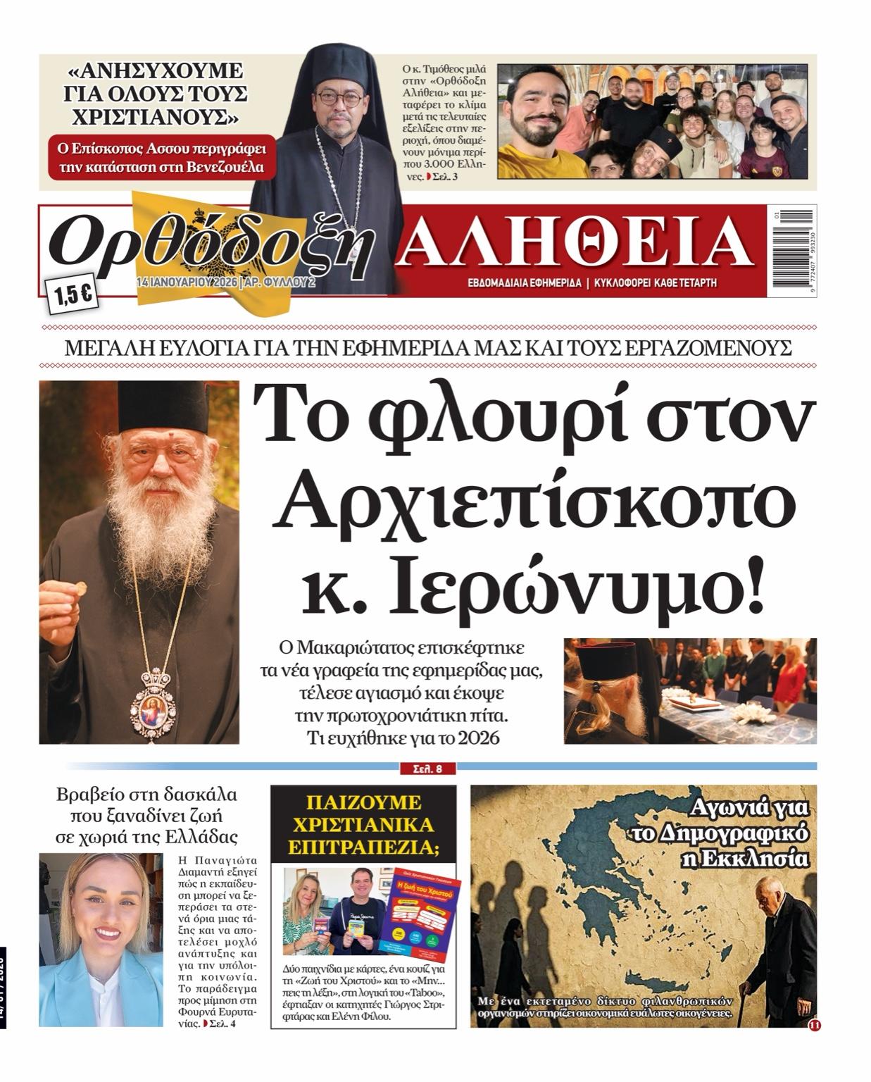 Στο τεύχος της “Ορθόδοξης Αλήθειας” που κυκλοφορεί αυτή την Τετάρτη στις 14/1 θα ξεφυλλίσετε σημαντικά θέματα που φωτίζουν την πίστη, την επικαιρότητα, την κοινωνία .