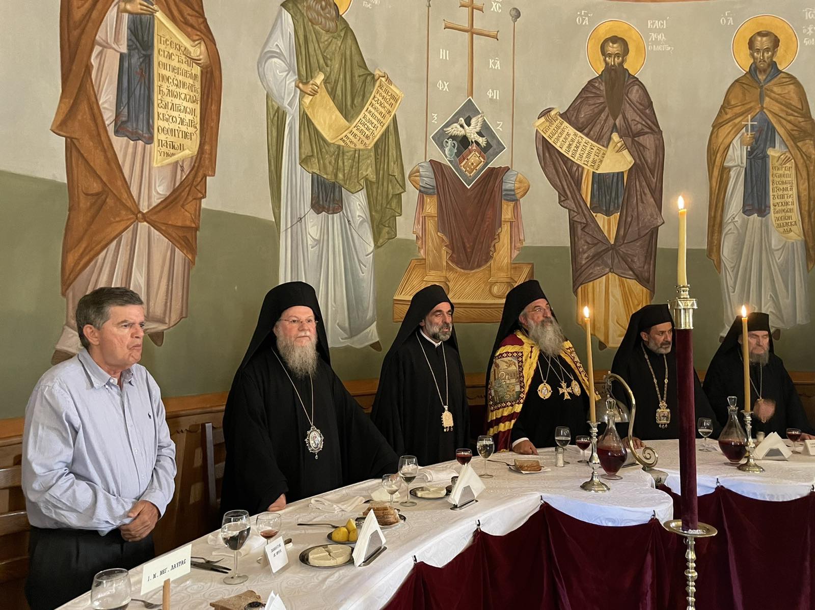 Στην Ιερά Μονή παρίστατο και ο εκ των αδελφών Ιεραρχών της Εκκλησίας Κρήτης, Σεβασμιώτατος Μητροπολίτης Πέτρας και Χερρονήσου κ. Γεράσιμος, ο οποίος επισκέφθηκε το Άγιον Όρος για να τελέσει τη Μεγάλη Θεομητορική Εορτή στον Πάνσεπτο Ιερό Ναό του Πρωτάτου, στις Καρυές του Αγίου Όρους.