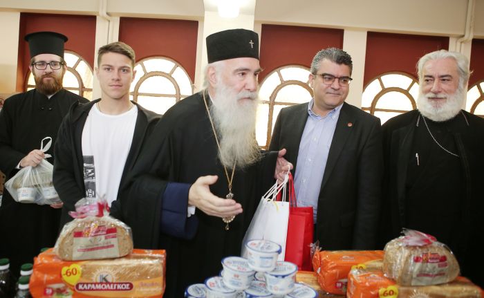 Ο Σεβασμιώτατος Μητροπολίτης Πειραιώς κ.κ. Σεραφείμ πήρε πρώτος τον λόγο και τόνισε: «Θέλω να εκφράσω την μεγάλη μου χαρά και ευγνωμοσύνη προς του παρισταμένους φίλους και αδελφούς, οι οποίοι συμπράττουν και συνεργούν σε αυτό το έργο της αγάπης, που δεν γίνεται σήμερα, ή μια φορά το χρόνο, ή δυο φορές, αλλά κάθε μέρα, 365 ημέρες το χρόνο. Αδιάκοπα και αδιάλειπτα. Αναφέρομαι στους δύο εκλεκτούς εκπροσώπους του ταυτισμένου με την πόλη μας, Ολυμπιακού Συνδέσμου Φιλάθλων Πειραιώς. Τον κύριο Παύλου, και τον κύριο Βασίλη Βασιλειάδη, οι οποίοι μεταφέρουν και τις ευχές του ιδιοκτήτη της ΠΑΕ Ολυμπιακός, κυρίου Βαγγέλη Μαρινάκη, ο οποίος συνεχώς προσφέρει, για την ανακούφιση των αδελφών μας, μέσα από πολλές δράσεις και διακονίες.