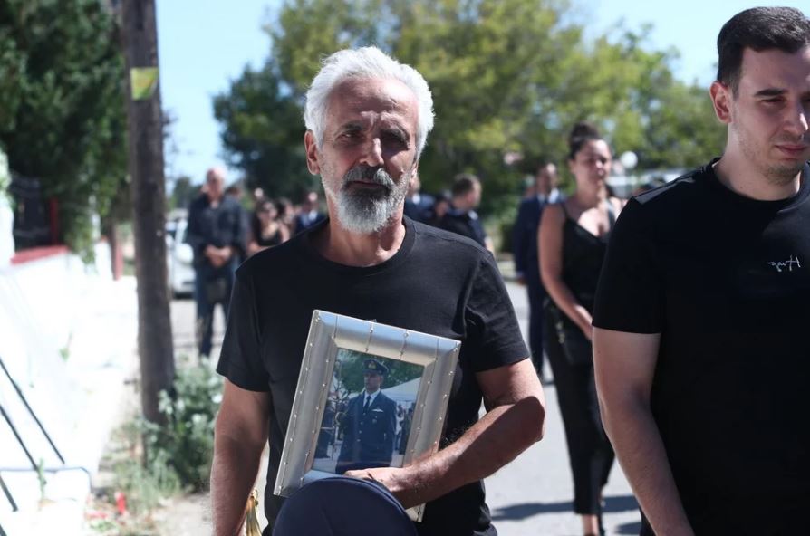 Η εξόδιος ακολουθία του πιλότου ξεκίνησε στις 5 το απόγευμα στον ιερό ναό Αγίου Γεωργίου Παλιού Αγιονερίου, παρουσία του πρωθυπουργού Κυριάκου Μητσοτάκη και του υπουργού Άμυνας Νίκου Δένδια.