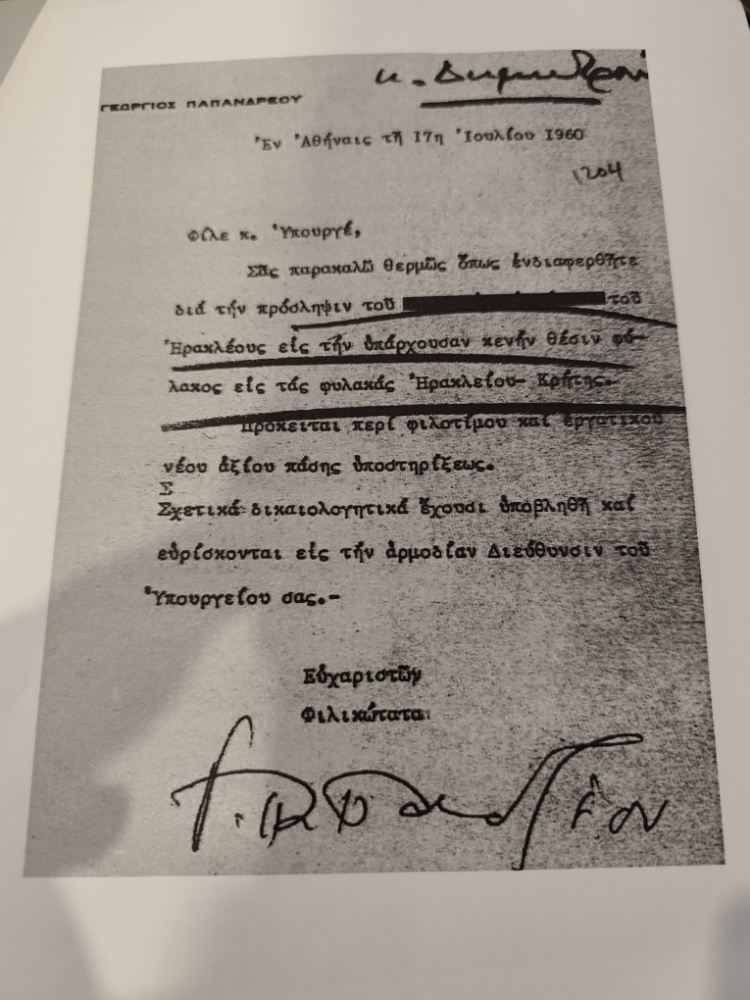 Λίγα χρόνια νωρίτερα, στις 17 Ιουλίου 1960, ο Γεώργιος Παπανδρέου απευθύνεται σε φίλο του Υπουργό για μια θέση στο δημόσιο. Το αίτημα αφορά την πρόσληψη ενός νέου στις φυλακές στο Ηράκλειο Κρήτης. Ο Παπανδρέου γράφει: «Φίλε κ. Υπουργέ, Σας παρακαλώ θερμώς όπως ενδιαφερθήτε διά την πρόσληψιν του […] εις την υπάρχουσαν κενήν θέσιν φύλακος εις τας φυλακάς Ηρακλείου – Κρήτης».